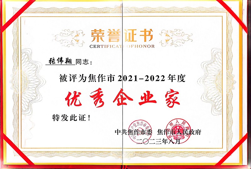 河南京華食品科技開發有限公司董事總經理張偉翔被評為2021-2022年度“焦作市優秀企業家”榮譽稱號。