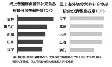 《研究》顯示,在吉林、黑龍江、山東、遼寧等北方省份,線上膳食補(bǔ)充相關(guān)的海外品牌和國(guó)內(nèi)品牌均受到了熱烈的歡迎,可見(jiàn)他們膳食營(yíng)養(yǎng)品補(bǔ)充意識(shí)相當(dāng)高;相比之下,作為一線城市的北京、上海、澳門則更多地將目光投向海外品牌。其中,值得注意的是新疆人民在線上膳食營(yíng)養(yǎng)品的消費(fèi)也表現(xiàn)不俗,基于新疆的整體消費(fèi)實(shí)力,他們對(duì)保健品的聚焦度可見(jiàn)一斑。