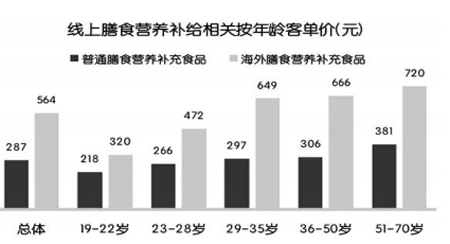 根據(jù)《研究》顯示,29—70歲的中老年人購(gòu)買的保健品客單價(jià)均在平均客單價(jià)之上,其中,海外版的平均客單價(jià)是普通版的2倍,足見(jiàn)消費(fèi)實(shí)力。此外,他們購(gòu)買海外版的頻次也相對(duì)更高。