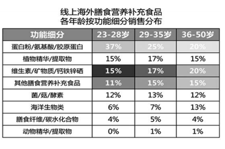 此外,為忙碌的上班族帶來(lái)便利的復(fù)合型功能保健品格外受到29—50歲年齡段人群的喜愛(ài)。其中,經(jīng)濟(jì)實(shí)力較強(qiáng)的36—50歲中年人群則更青睞海外保健產(chǎn)品。